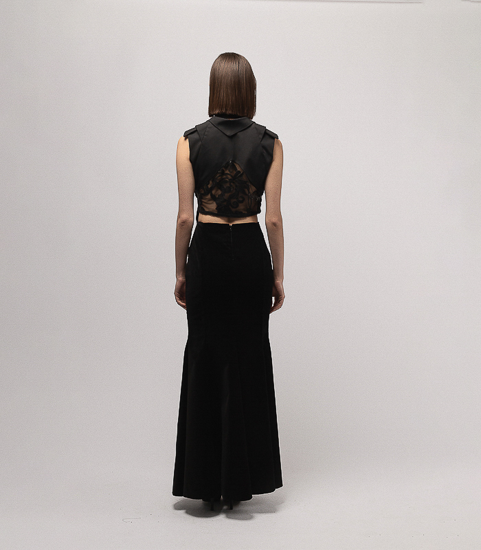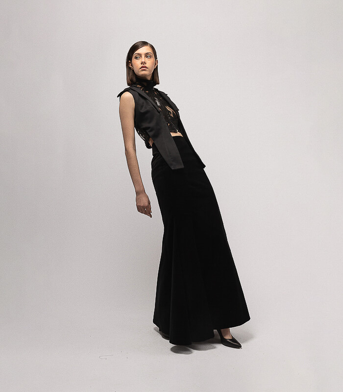 Falda de corte sirena confeccionada en terciopelo italiano, con forro interior en tafetán japonés. Su moldería está diseñada para contener y remarcar la silueta, realzando el cuerpo con precisión. El vuelo amplio desde las rodillas otorga movimiento y dramatismo, sin perder estructura.